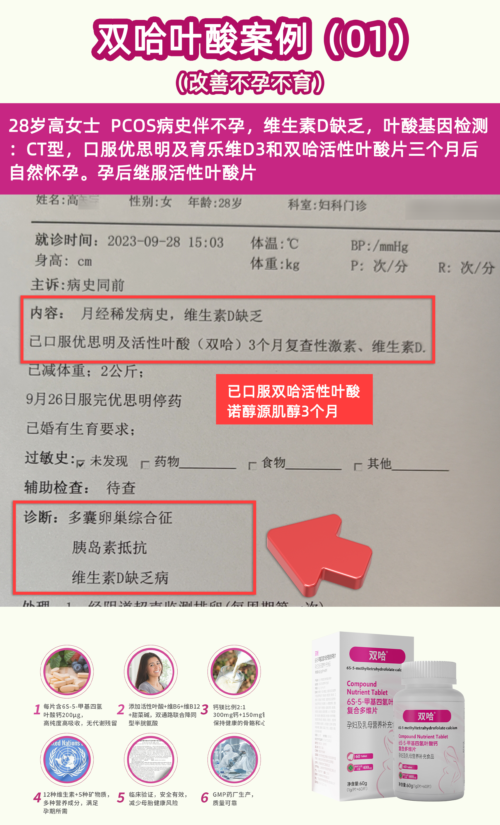 高女士 28岁,6月来院检查,诊断为PCOS,维D缺乏,月经稀发,有生育要求,随用优思明联合双哈活性叶酸,育乐维D3治疗3个月,减体重2公斤,月经、维D水平有改善,正常备孕。10月底复查怀孕,同时查叶酸CT型,HCY正常,继续服用双哈活性叶酸复合片,目前孕8周,胎儿发育正常。